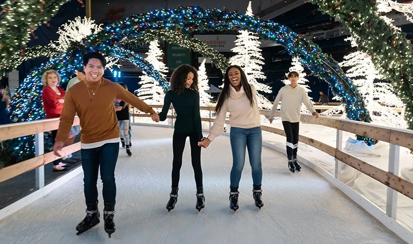 Disfruta de un relajante paseo por el laberinto de luces, compre artesanía en la aldea invernal, dé una vuelta por la pista de patinaje sobre hielo, tome bebidas de temporada y hágase una foto con Papá Noel.