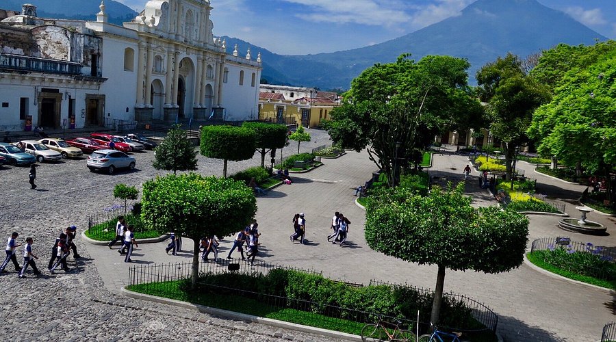 El Parque Central de Antigua es el corazón palpitante de la ciudad. La Fuente de las Sirenas domina la plaza, con sus esculturas de sirenas y criaturas míticas mientras el agua fluye elegantemente.