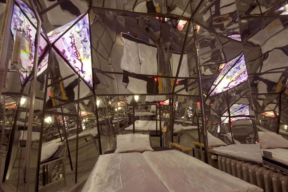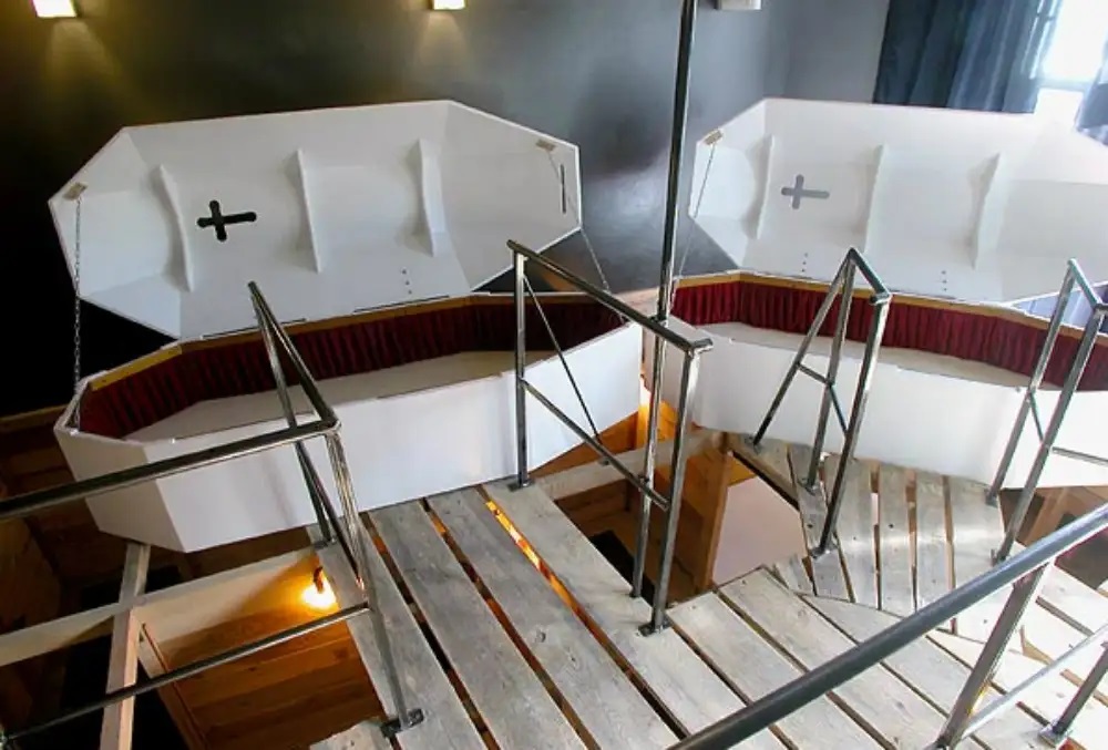 ???? Experiencia: Cada una de las 30 habitaciones es una instalación artística única, incluyendo una cama dentro de un ataúd gigante y una celda de monje con suelo inclinado.